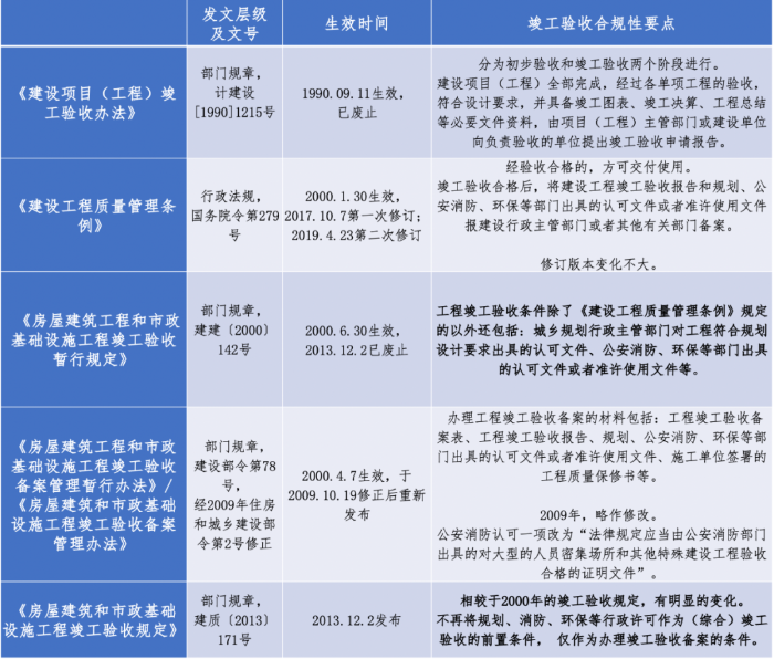 编者按 新中国成立以来,我国基础设施投资建设取得了举世瞩目的成就,是国家经济社会发展的重要支撑,为人民生活水平的提高做出了巨大贡献。改革开放以来,市场开始发挥配置资源的决定性作用,为我国基础设施的发展焕发了新的活力。据统计,我国基础设施资产总规模在1990年排在全世界约第15位,2000年上升到第7位,2010年跃升为第3位,至2018年已居世界首位。 党的二十大报告在回顾过去五年的工作和新时代十年的伟大变革中,充分肯定了基础设施在经济社会中发挥的重要作用。报告指出,我国“建成世界最大的高速铁路网、高速公路网,机场港口、水利、能源、信息等基础设施建设取得重大成就”。我国基础设施多年来大规模的投资建设和存量资产的高速积累,是党中央、国务院在建立社会主义市场经济体制背景下,关于投融资体制改革部署的重要成果。 项目前期工作手续的合规性要求,是基础设施能够发挥其应有价值的重要前提,也是投融资体制改革关注的重点内容之一。伴随着政府职能转变、深化“放管服”改革和扩大有效投资等重大决策的关键部署,我国工程建设项目审批制度不断优化和改革,基础设施项目投资前期决策管理经历了复杂的演变进程,其合规性标准也在与时俱进、不断完善。当前我国已进入基础设施存量时代,存量资产项目前期工作手续的合规性是重要的盘活条件之一,部分合规性问题已成为新时代社会广泛关注的焦点。本项专题研究立足投融资体制和项目审批制度变革的历史背景,尝试厘清基础设施项目在立项、土地、规划、环境、建设施工等方面主要前期工作的历史变革脉络,梳理不同管理事项之间的逻辑关联,从这一视角提供基础设施项目前期工作手续的合规性认识。本公众号将研究报告的部分成果以系列文章的形式陆续刊发,研究报告第一部分为背景与立项篇,第二部分为土地与规划篇,本文是系列研究报告的第三部分(建设施工篇),供业界同仁参考。 基础设施项目前期工作手续合规性研究(Ⅲ) 张雪飞 伍迪 摘要:开工和竣工是基础设施项目建设施工方面的重要工作节点,依法合规开展有关工作是项目的合规性前提。建筑工程施工许可证(或开工报告)是建筑施工单位符合施工条件、允许开工的批准文件,是建设单位进行工程施工的法律凭证,是工程项目由实施准备转向施工建设、由蓝图设计变成项目实体的重要工作手续。竣工验收是建设工程项目竣工后,全面考核建设工作、检查是否符合设计要求和工程质量的重要环节,是工程项目由施工建设走向运营投产,是建设投资成果转入交付使用的关键工作事项。本文聚焦基础设施项目建设施工方面的手续,尤其对施工许可和竣工验收两方面的主要内容和制度演进进行系统梳理,供业界参考。 关键词:基础设施;合规性;施工许可;竣工验收;政策演进 一、施工许可手续合规性 (一)内涵与适用范围 建筑工程施工许可证是建筑施工单位符合施工条件、允许开工的批准文件,是建设单位进行工程施工的法律凭证。根据有关法律政策规定,在中华人民共和国境内从事各类房屋建筑及其附属设施的建造、装修装饰和与其配套的线路、管道、设备的安装,以及城镇市政基础设施工程的施工,建设单位在开工前应当向工程所在地县级以上人民政府建设行政主管部门申请领取施工许可证,国务院建设行政主管部门确定的限额以下的小型工程除外。具体而言,对于工程投资额在30万元以下或者建筑面积在300平方米以下的建筑工程,可以不申请办理施工许可证。各省、自治区、直辖市人民政府住房城乡建设主管部门可以根据当地的实际情况,对限额进行调整,并报国务院住房城乡建设主管部门备案。按照国务院规定的权限和程序批准开工报告的建筑工程,不再领取施工许可证。 办理施工许可证有关事项应主要以《中华人民共和国建筑法》(以下简称《建筑法》)和《建筑工程施工许可管理办法》等法规政策为依据。根据最新修订且现行有效的2019年版《建筑法》和2021年版《建筑工程施工许可管理办法》,申请领取施工许可证,应当符合的条件包括:(1)依法应当办理用地批准手续的,已经办理该建筑工程用地批准手续;(2)依法应当办理建设工程规划许可证的,已经取得建设工程规划许可证;(3)施工场地已经基本具备施工条件,需要征收房屋的,其拆迁进度符合施工要求;(4)已经确定建筑施工企业;(5)有满足施工需要的资金安排、施工图纸及技术资料,其中施工图设计文件已按规定审查合格;(6)有保证工程质量和安全的具体措施。 施工许可证的时效方面,根据有关规定,建设单位应当自领取施工许可证之日起3个月内开工。因故不能按期开工的,应当向发证机关申请延期;延期以两次为限,每次不超过3个月。既不开工又不申请延期或者超过延期时限的,施工许可证自行废止。在建的建筑工程因故中止施工的,建设单位应当自中止施工之日起1个月内,向发证机关报告,并按照规定做好建筑工程的维护管理工作。建筑工程恢复施工时,应当向发证机关报告;中止施工满1年的工程恢复施工前,建设单位应当报发证机关核验施工许可证。按照国务院有关规定批准开工报告的建筑工程,因故不能按期开工或者中止施工的,应当及时向批准机关报告情况。因故不能按期开工超过6个月的,应当重新办理开工报告的批准手续。 (