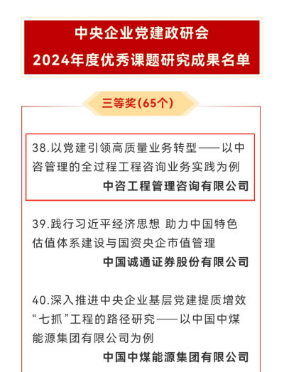 党建领航促发展,政研成果传佳讯。近日,中央企业党建政研会2024年度优秀课题研究成果评选结果公布,中咨公司所属的中咨工程管理咨询有限公司(以下简称中咨管理公司)《以党建引领高质量业务转型——以中咨管理的全过程工程咨询业务实践为例》研究成果荣获三等奖。