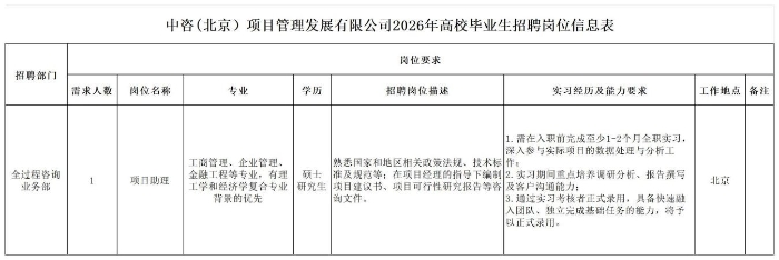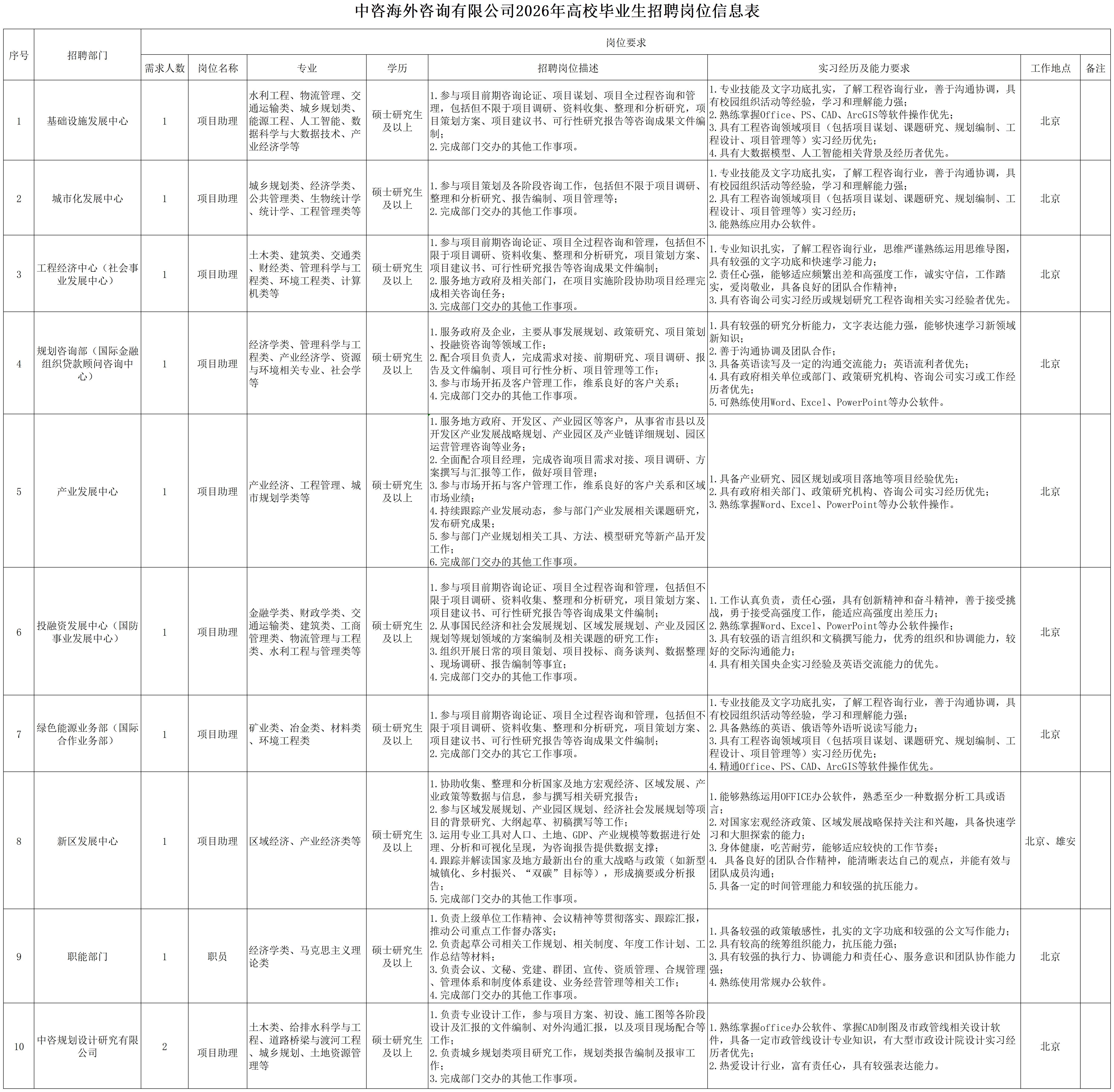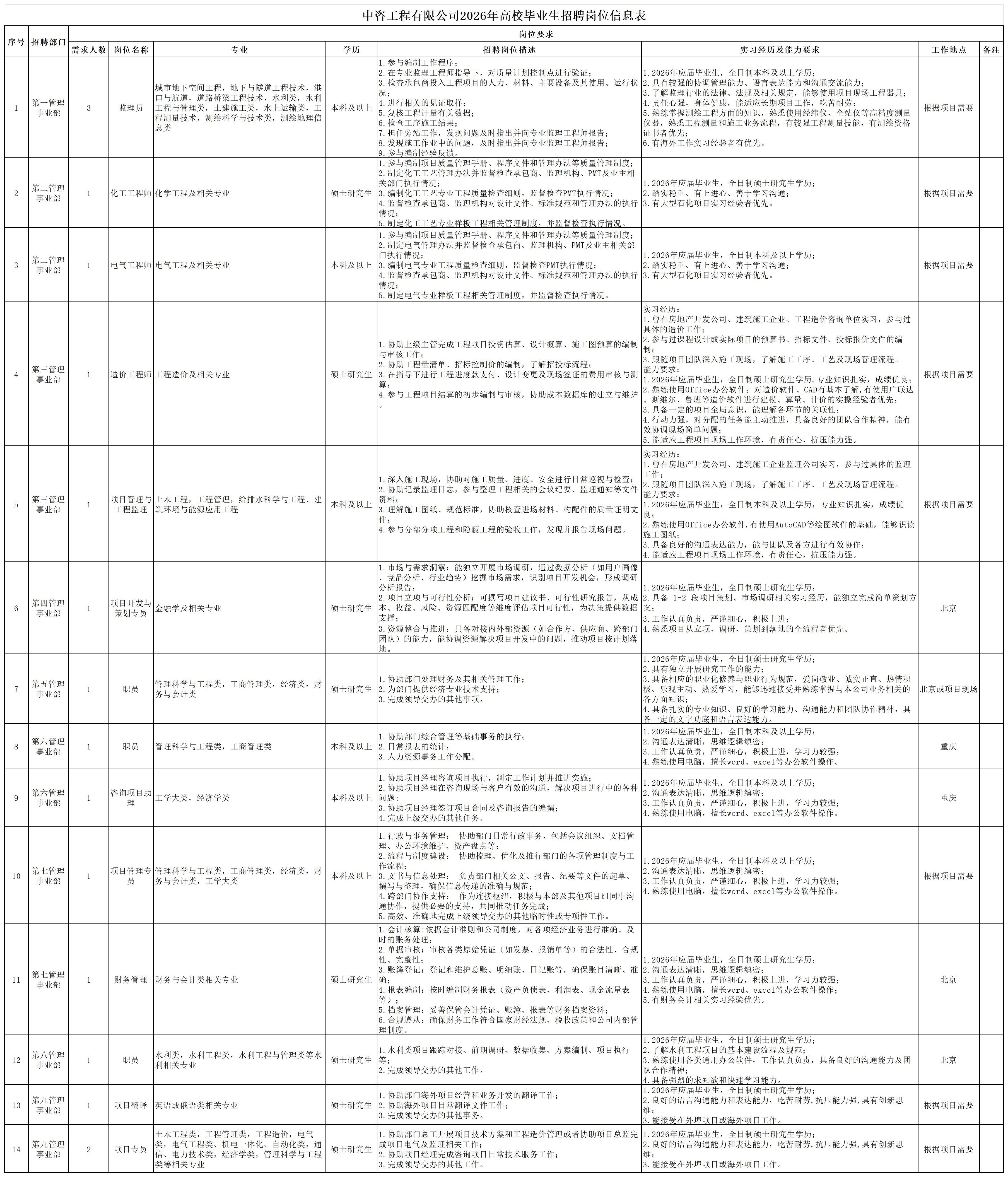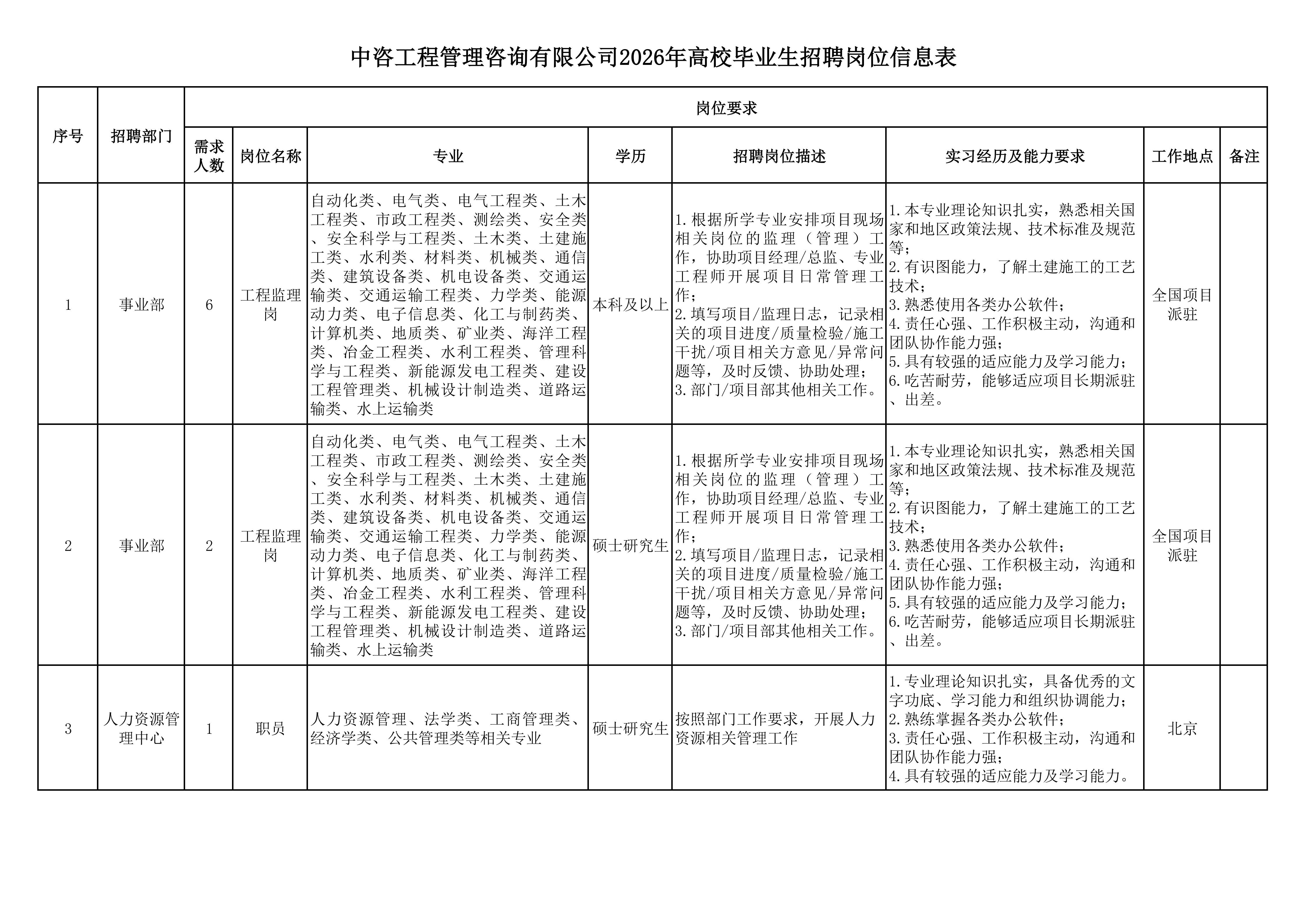 一、公司简介 中咨工程管理咨询有限公司(简称中咨管理)成立于1989年,是188bet官方平台 的核心骨干子公司,注册资金1.55亿元。现有各项资质证书持证2800余册,中高级职称比例超50%。 中咨管理公司是国内从事工程管理类业务最早、规模最大、行业最广、业绩最多的企业之一,具有工程咨询甲级资信、工程监理综合资质以及设备、公路工程、地质灾害防治工程、人民防空工程等多项专业监理甲级资质,并列入政府采购招标代理机构和中央投资项目招标代理机构名单。业务涵盖工程前期咨询、项目管理、项目代建、招标代理、造价咨询、工程监理、设备监理、设计优化、工程质量安全评估咨询等项目全过程咨询服务,涉及房屋建筑、交通、石化、水利、电力、冶炼、矿山、市政、生态环境、通信和信息化等多个行业。业务遍布全国及全球近50个国家和地区,累计服务各类咨询管理项目超过1万个,涉及工程建设投资近5万亿元。曾荣获56项中国建设工程鲁班奖、15项中国土木工程詹天佑奖、64项国家优质工程奖、23项中国钢结构金奖以及各类省级或行业奖项500余项。 经过30余年的不懈努力,我们积累了丰富的工程管理经验,为各类工程建设项目保驾护航,“中咨管理”品牌成为行业的一面旗帜。我们崇尚简单、包容、共享的理念,秉持创造价值、贡献社会的使命和专业创造精品、价值成就客户的核心价值观,为成为全过程工程管理咨询的领先者而奋斗。优秀的你值得更好的平台,加入我们,携手共创新篇章! 二、应聘条件 (一)2026年全日制本科及以上应届毕业生。 (二)年龄要求:本科生26周岁及以下(2000年1月1日后出生),硕士研究生30周岁及以下(1996年1月1日后出生)。 (三)在校就读期间无在职工作经历,无社保缴纳记录和派遣落户记录。 (四)成绩优秀,人品端正,积极进取,愿与公司共改革、奋进。 (五)具备扎实的专业理论知识和良好的沟通能力,实践能力较强。 (六)熟练使用各类办公软件。 (七)简历需注明出生日期、生源地(即入学前户籍所在地)。 三、应聘程序 发布招聘公告→简历投递→简历筛选→笔试→面试→确定人选并公示→发放录用通知。 四、岗位信息 五、报名方式 本次招聘报名采取在线填报方式进行:应聘者请使用Chrome内核浏览器(如:Chrome浏览器、360浏览器、百度浏览器、搜狗浏览器、UC浏览器等)登录网站报名,网站链接:https://hcmcloud.ciecc.com.cn/recruit/#/index 或使用手机扫描二维码: 中咨工程有限公司 一、 公司简介 中咨工程有限公司成立于2010年,是188bet官方平台 (简称中咨公司)的控股子公司,由中咨公司和中国广核电力股份有限公司合资成立。 公司作为中咨公司工程管理业务板块的核心成员,主营业务为全过程工程管理(咨询)服务业务,包括全过程中的各节点业务(1+X),188金宝搏解冻帮助 涉及石化、核电、冶金、交通和民用市政等多个领域行业工程项目的前期咨询及咨询管理、勘察管理、设计管理、监理、采购管理、造价咨询、建造过程管理、项目管理(IPMT、PMC等)、项目代建和技术服务等。 公司以为国家、社会和股东创造价值为己任,以两大股东提供的广阔市场机遇和成熟先进的管理体系为发展驱动力,通过积极参与市场竞争,努力培育公司核心竞争能力,打造一支特别能战斗的具有复合型人才的专业化队伍,矢志发展成为具备承接大中型全过程工程管理(咨询)服务业务能力的、具有国际竞争力的工程公司。 二、 应聘条件 (一)2026年全日制本科及以上应届毕业生(部分岗位硕士研究生学历),在校就读期间无在职工作经历,无社保缴纳记录和派遣落户记录,学习成绩优良。 (二)良好的语言表达能力和沟通能力,执行力强,学习能力强,协作能力强。 (三)身体健康,具有良好的职业道德修养,具有较强的责任心。 (四)熟练使用常用办公软件,具有一定的文字功底。 (五)无违规违法记录,无不良嗜好,身体素质好,能吃苦耐劳,能承受较大的工作压力。 三、 招聘程序 发布招聘公告→简历筛选→资格审查→综合能力测评→面试→确定人选并公示→发放录用通知→入职。 四、 岗位信息 五、 报名方式 本次招聘报名采取在线填报方式进行:应聘者请使用Chrome内核浏览器(如:Chrome浏览器、360浏览器、百度浏览器、搜狗浏览器、UC浏览器等)登录网站报名,网站链接:https://hcmcloud.ciecc.com.cn/recruit/#/index 或使用手机扫描二维码: 中咨海外咨询有限公司 一、公司简介 中咨海外咨询有限公司是188bet官方平台 所属二级子公司,于1988年成立,经过30多年发展,为各级政府、企事业单位提供了万余项咨询服务,在国内咨询领域具有一定知名度和较高信誉,具备较好的发展基础。2021年入选国资委“管理标杆”企业,2022-2025年连续4年蝉联国资委“双百行动标杆”企业。 公司主要从事战略谋划、投资策划、全过程咨询以及规划设计和建设投资管理经营五大业务。善于谋划策划创造发展新优势,努力成为工程建设领域原创思想策源地;善于科学设计项目功能成本方案,致力成为国内优化设计领域先行者;善于系统提供区域发展整体解决方案,努力成为国内有影响力的具有研究特质的咨询设计企业。公司为国家高新技术企业,拥有工程咨询行业综合甲级资信、15项专业专项甲级资信;公路、建筑、市政行业7项专业甲级设计资质;市政行业2项专业乙级设计资质;城乡规划编制乙级资质;工