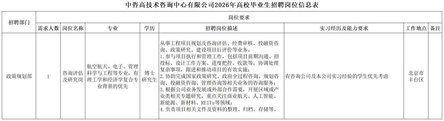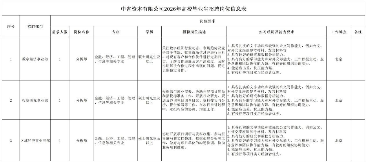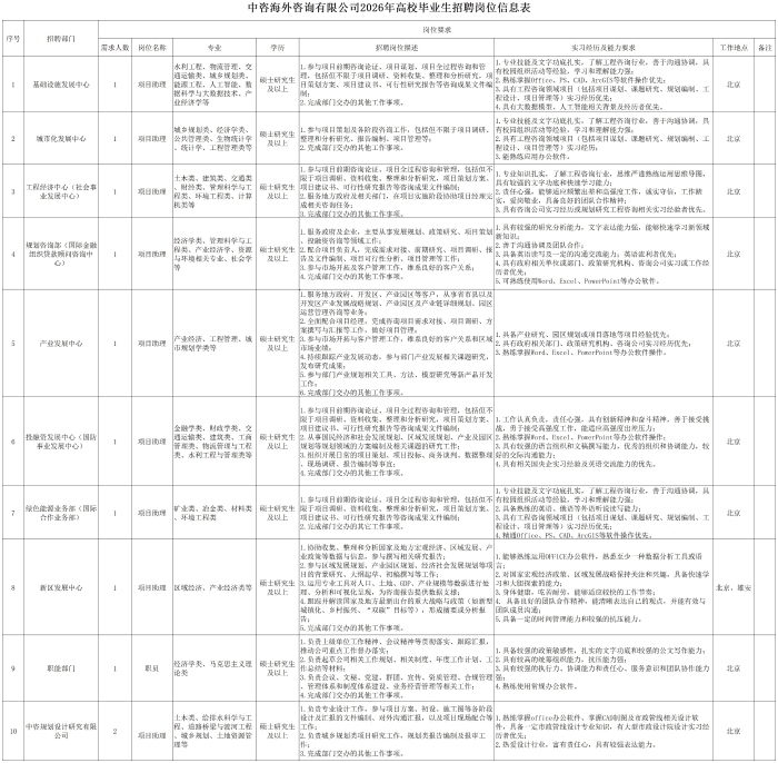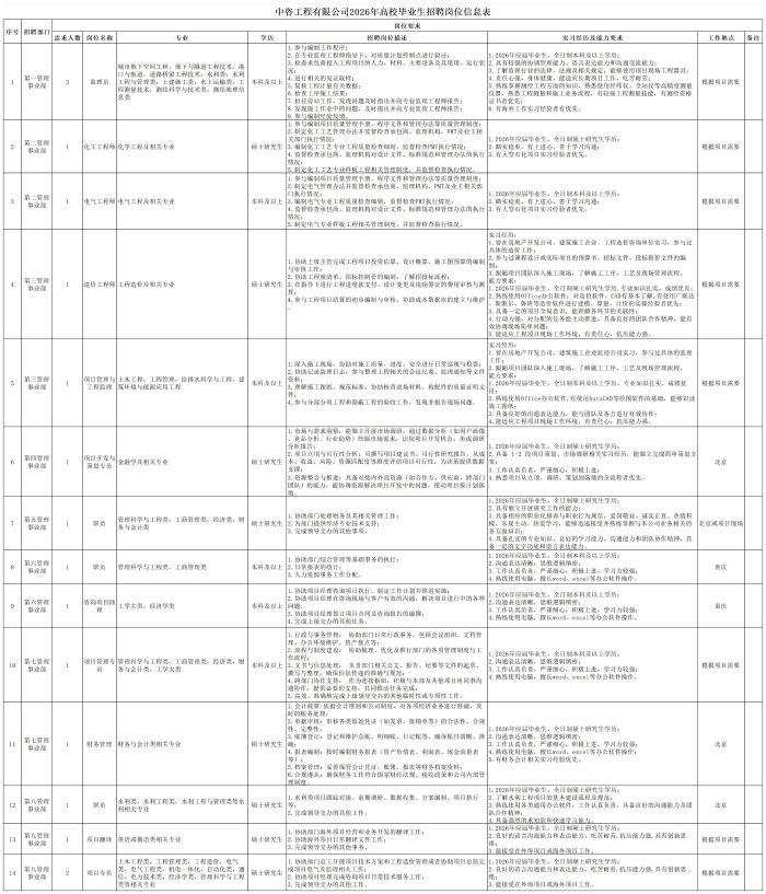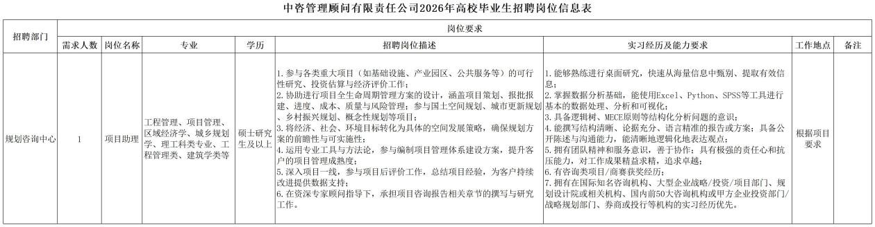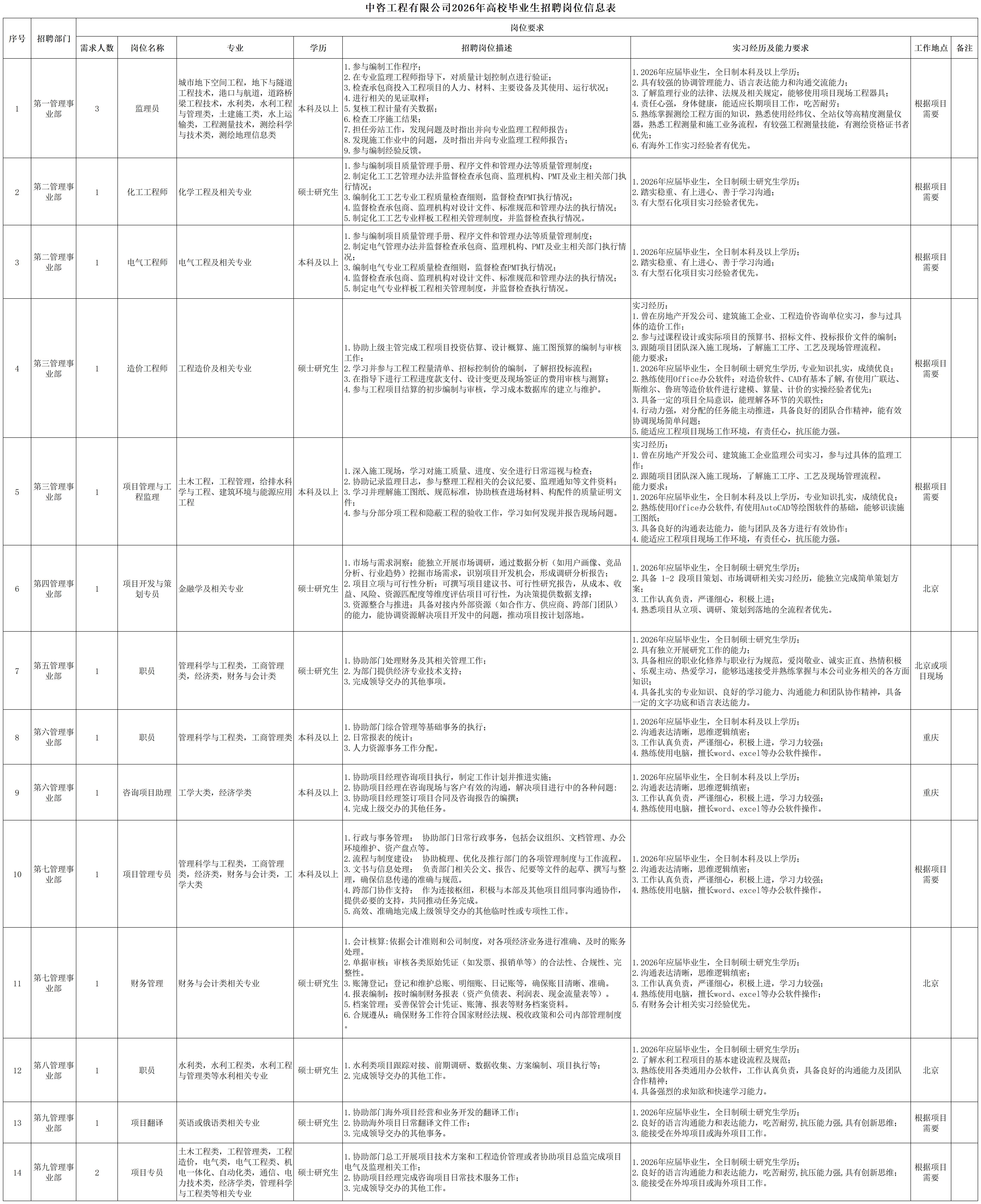 一、公司简介 中咨工程管理咨询有限公司(简称中咨管理)成立于1989年,是188bet官方平台 的核心骨干子公司,注册资金1.55亿元。现有各项资质证书持证2800余册,中高级职称比例超50%。 中咨管理公司是国内从事工程管理类业务最早、规模最大、行业最广、业绩最多的企业之一,具有工程咨询甲级资信、工程监理综合资质以及设备、公路工程、地质灾害防治工程、人民防空工程等多项专业监理甲级资质,并列入政府采购招标代理机构和中央投资项目招标代理机构名单。业务涵盖工程前期咨询、项目管理、项目代建、招标代理、造价咨询、工程监理、设备监理、设计优化、工程质量安全评估咨询等项目全过程咨询服务,涉及房屋建筑、交通、石化、水利、电力、冶炼、矿山、市政、生态环境、通信和信息化等多个行业。业务遍布全国及全球近50个国家和地区,累计服务各类咨询管理项目超过1万个,涉及工程建设投资近5万亿元。曾荣获56项中国建设工程鲁班奖、15项中国土木工程詹天佑奖、64项国家优质工程奖、23项中国钢结构金奖以及各类省级或行业奖项500余项。 经过30余年的不懈努力,我们积累了丰富的工程管理经验,为各类工程建设项目保驾护航,“中咨管理”品牌成为行业的一面旗帜。我们崇尚简单、包容、共享的理念,秉持创造价值、贡献社会的使命和专业创造精品、价值成就客户的核心价值观,为成为全过程工程管理咨询的领先者而奋斗。优秀的你值得更好的平台,加入我们,携手共创新篇章! 二、应聘条件 (一)2026年全日制本科及以上应届毕业生。 (二)年龄要求:本科生26周岁及以下(2000年1月1日后出生),硕士研究生30周岁及以下(1996年1月1日后出生)。 (三)在校就读期间无在职工作经历,无社保缴纳记录和派遣落户记录。 (四)成绩优秀,人品端正,积极进取,愿与公司共改革、奋进。 (五)具备扎实的专业理论知识和良好的沟通能力,实践能力较强。 (六)熟练使用各类办公软件。 (七)简历需注明出生日期、生源地(即入学前户籍所在地)。 三、应聘程序 发布招聘公告→简历投递→简历筛选→笔试→面试→确定人选并公示→发放录用通知。 四、岗位信息 五、报名方式 本次招聘报名采取在线填报方式进行:应聘者请使用Chrome内核浏览器(如:Chrome浏览器、360浏览器、百度浏览器、搜狗浏览器、UC浏览器等)登录网站报名,网站链接:https://hcmcloud.ciecc.com.cn/recruit/#/index 或使用手机扫描二维码: 中咨工程有限公司 一、 公司简介 中咨工程有限公司成立于2010年,是188bet官方平台 (简称中咨公司)的控股子公司,由中咨公司和中国广核电力股份有限公司合资成立。 公司作为中咨公司工程管理业务板块的核心成员,主营业务为全过程工程管理(咨询)服务业务,包括全过程中的各节点业务(1+X),188金宝搏解冻帮助 涉及石化、核电、冶金、交通和民用市政等多个领域行业工程项目的前期咨询及咨询管理、勘察管理、设计管理、监理、采购管理、造价咨询、建造过程管理、项目管理(IPMT、PMC等)、项目代建和技术服务等。 公司以为国家、社会和股东创造价值为己任,以两大股东提供的广阔市场机遇和成熟先进的管理体系为发展驱动力,通过积极参与市场竞争,努力培育公司核心竞争能力,打造一支特别能战斗的具有复合型人才的专业化队伍,矢志发展成为具备承接大中型全过程工程管理(咨询)服务业务能力的、具有国际竞争力的工程公司。 二、 应聘条件 (一)2026年全日制本科及以上应届毕业生(部分岗位硕士研究生学历),在校就读期间无在职工作经历,无社保缴纳记录和派遣落户记录,学习成绩优良。 (二)良好的语言表达能力和沟通能力,执行力强,学习能力强,协作能力强。 (三)身体健康,具有良好的职业道德修养,具有较强的责任心。 (四)熟练使用常用办公软件,具有一定的文字功底。 (五)无违规违法记录,无不良嗜好,身体素质好,能吃苦耐劳,能承受较大的工作压力。 三、 招聘程序 发布招聘公告→简历筛选→资格审查→综合能力测评→面试→确定人选并公示→发放录用通知→入职。 四、 岗位信息 五、 报名方式 本次招聘报名采取在线填报方式进行:应聘者请使用Chrome内核浏览器(如:Chrome浏览器、360浏览器、百度浏览器、搜狗浏览器、UC浏览器等)登录网站报名,网站链接:https://hcmcloud.ciecc.com.cn/recruit/#/index 或使用手机扫描二维码: 中咨海外咨询有限公司 一、公司简介 中咨海外咨询有限公司是188bet官方平台 所属二级子公司,于1988年成立,经过30多年发展,为各级政府、企事业单位提供了万余项咨询服务,在国内咨询领域具有一定知名度和较高信誉,具备较好的发展基础。2021年入选国资委“管理标杆”企业,2022-2025年连续4年蝉联国资委“双百行动标杆”企业。 公司主要从事战略谋划、投资策划、全过程咨询以及规划设计和建设投资管理经营五大业务。善于谋划策划创造发展新优势,努力成为工程建设领域原创思想策源地;善于科学设计项目功能成本方案,致力成为国内优化设计领域先行者;善于系统提供区域发展整体解决方案,努力成为国内有影响力的具有研究特质的咨询设计企业。公司为国家高新技术企业,拥有工程咨询行业综合甲级资信、15项专业专项甲级资信;公路、建筑、市政行业7项专业甲级设计资质;市政行业2项专业乙级设计资质;城乡规划编制乙级资质;工