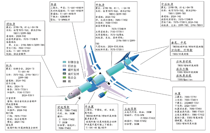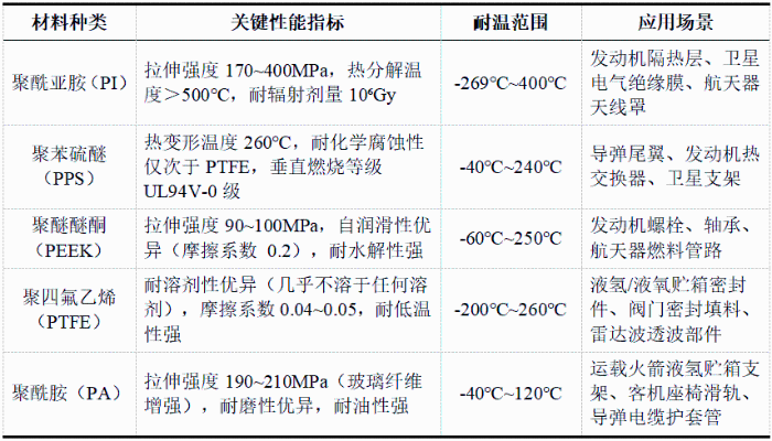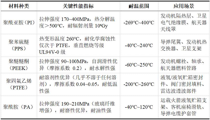航空航天领域用化工新材料发展趋势研究 詹宇鹏 王鹏 齐景丽 航空航天工业作为战略性新兴产业,是国家综合竞争力的核心体现,对国民经济发展和工业技术创新具有显著的带动效应。化工新材料作为现代高新技术和产业发展的基石与引领力量,其发展水平直接决定航空航天装备的迭代升级。“一代材料,一代航空航天器”的演进规律表明,化工新材料作为航空航天装备的核心物质基础和性能决定因素,已成为影响装备性能、安全性和成本控制的关键要素。 本文聚焦航空航天领域化工新材料发展,系统分析其发展必要性、技术与应用现状,重点梳理弹性体功能材料、纤维及复合材料、特种工程塑料、特种工程树脂等关键品类的技术特征与应用场景,揭示当前我国该领域存在的核心材料依赖进口、产品质量稳定性不足、产业链协同低效、标准与验证平台缺失等问题。基于此,本文从强化核心技术攻关、优化产业链协同、完善标准体系、构建创新生态四个维度提出发展建议。通过系统推进这些建设性举措,旨在实现航空航天用化工新材料的自主可控、安全高效发展,以期为国防现代化建设提供坚实的材料保障。 一、推进航空航天用化工新材料发展的战略必要性 (一)政策驱动为产业发展提供战略指引 党的二十大报告明确提出“加快建设航天强国”的战略目标,充分肯定我国在载人航天、探月工程、火星探测、北斗卫星导航系统等领域的突破性进展,高度评价国产大飞机C919等标志性成果。《中国制造2025》将航空航天装备列为十大重点发展领域之一,明确指出“新材料是产业升级的基础支撑”,要求突破航空航天用高端化工新材料产业化瓶颈。在“双碳”战略引领下,国家正聚焦航空航天产业链关键环节,着力推进高端“卡脖子”化工新材料国产化替代,为产业高质量发展构建清晰的战略路径。 (二)产业特征决定化工新材料核心地位 航空航天装备需在超高温、超低温、高真空、强腐蚀等极端环境下长期稳定工作,对材料提出“轻质高强、耐高低温、抗疲劳、长寿命”的严苛要求。以商用大飞机为例,一架C919由300万~500万个零部件构成,其中化工新材料重量约占飞机总重量15%,其轻量化程度直接影响整机燃油效率与航程。航天领域材料性能对装备效能影响更为显著,固体火箭发动机壳体采用碳纤维复合材料后,重量较传统金属材料降低约30%,发动机推重比(推进剂质量/发动机总质量)提升至0.93以上,凸显化工新材料对航空航天装备性能的决定性作用。 (三)市场需求为产业发展注入强劲动力 全球航空航天产业的蓬勃发展正催生化工新材料领域的强劲需求,产业链上下游协同效应持续显现。据空中客车发布的《2023至2042年全球航空服务市场预测报告》显示,未来20年,中国航空客运量年均增长率将达到5.2%,是全球平均水平的近两倍,中国新飞机需求量将超过9000架。这将带动航空用化工新材料需求年均增长8%以上。在商业航天领域,我国市场规模已从2015年的不足500亿元跃升至2024年的2万亿元,年均复合增长率超过20%。随着商用卫星组网、可回收火箭等新业态的规模化发展,对低成本、高品质的化工新材料的需求将呈持续增长态势。 (四)材料升级是突破产业瓶颈关键路径 我国航空航天工业虽取得显著成就(如航天发射次数连续多年全球领先、C919实现商业交付),但航空航天领域用材仍呈现“多品种、小批量、高品质”的特点,导致部分关键化工新材料仍依赖进口:高性能碳纤维(T1000级)、对位芳纶等产品进口依存度超50%,严重制约了航空航天装备的自主化进程。例如,导弹用T1000级碳纤维长期依赖日本东丽、美国赫氏等企业;商用大飞机C919的发动机涡轮部件(陶瓷基复合材料)、雷达罩用高端玻璃纤维仍需进口。同时,商用航天、深空探测等新场景对材料提出“低成本、多功能、环境相容”等新需求,亟需通过材料技术升级实现从“能用”到“好用”的跨越。 图1 商用大飞机用化工新材料示意图 二、航空航天用化工新材料的技术发展现状 航空航天领域用化工新材料已基本形成“功能导向、品类细分”的产品体系,重点覆盖弹性体材料、纤维及复合材料、特种工程塑料、特种合成树脂、特种胶黏剂、特种涂层等六大领域,各品类在装备中承担核心功能,其技术水平直接装备性能等级相匹配。 (一)纤维复合材料助力装备轻量化 纤维及复合材料通过“高性能纤维增强+树脂基体复合”的结构,实现“低密度+高比强度+高比模量”的性能组合,是航空航天材料结构轻量化的“主力军”,其应用比例已成为衡量装备技术先进性的重要指标。 1.碳纤维及复合材料。碳纤维比强度7~10倍于钢材料,比模量3倍于铝合金材料,在机身、机翼、发动机壳体等部位有着广泛应用。根据纤维丝束数量与力学性能,碳纤维可分为不同品类,具体分类如下表所示: 表1 碳纤维分类情况表 数据来源:作者整理。 在航空领域,碳纤维复合材料的应用比例持续提升,C919机身结构中碳纤维复合材料占比约12%,C929远程宽体客机占比达50%以上。 表2 航空领域碳纤维应用情况表 数据来源:作者整理。 在航天领域,碳纤维复合材料已成为固体火箭发动机壳体的首选材料,美国“三叉戟”(D5)导弹一级发动机壳体采用碳/环氧复合材料,综合性能较芳纶复合材料提升30%;我国部分型号导弹三级发动机壳体采用国产T800级