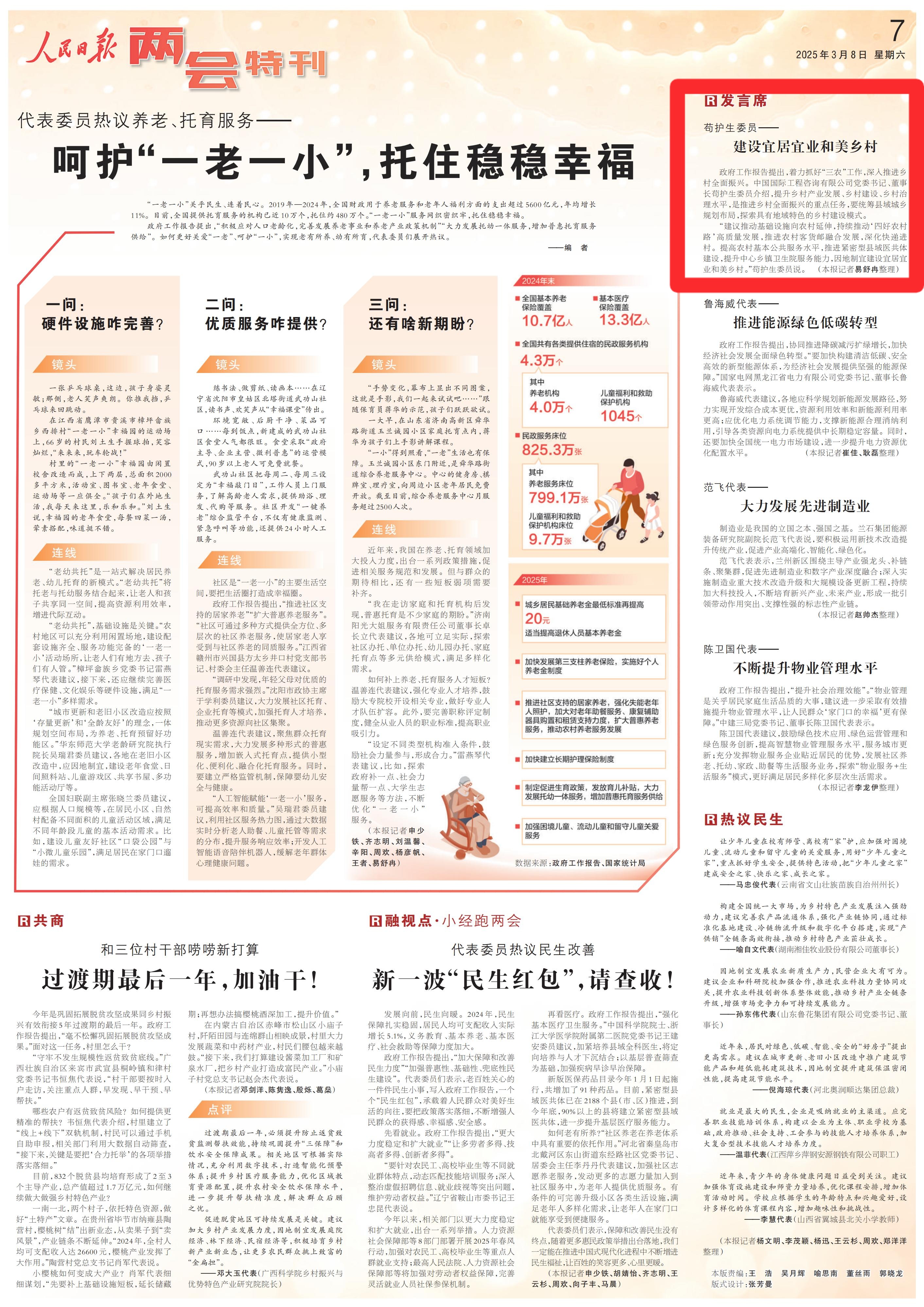 苟护生委员—— 建设宜居宜业和美乡村 政府工作报告提出,着力抓好“三农”工作,深入推进乡村全面振兴。188bet官方平台 党委书记、董事长苟护生委员介绍,提升乡村产业发展、乡村建设、乡村治理水平,是推进乡村全面振兴的重点任务,要统筹县域城乡规划布局,探索具有地域特色的乡村建设模式。 “建议推动基础设施向农村延伸,持续推动‘四好农村路’高质量发展,推进农村客货邮融合发展,深化快递进村。提高农村基本公共服务水平,推进紧密型县域医共体建设,提升中心乡镇卫生院服务能力,因地制宜建设宜居宜业和美乡村。”苟护生委员说。 (本报记者易舒冉整理) 鲁海威代表—— 推进能源绿色低碳转型 政府工作报告提出,协同推进降碳减污扩绿增长,加快经济社会发展全面绿色转型。“要加快构建清洁低碳、安全高效的新型能源体系,为经济社会发展提供坚强的能源保障。”国家电网黑龙江省电力有限公司党委书记、董事长鲁海威代表表示。 鲁海威代表建议,各地应科学规划新能源发展路径,努力实现开发综合成本更优,资源利用效率和新能源利用率更高;应优化电力系统调节能力,支撑新能源合理消纳利用,引导各类资源向电力系统提供中长期稳定容量。同时,还要加快全国统一电力市场建设,进一步提升电力资源优化配置水平。 (本报记者崔佳、耿磊整理) 范飞代表—— 大力发展先进制造业 制造业是我国的立国之本、强国之基。兰石集团能源装备研究院副院长范飞代表说,要积极运用新技术改造提升传统产业,促进产业高端化、智能化、绿色化。 范飞代表表示,兰州新区围绕主导产业强龙头、补链条、聚集群,促进先进制造业和数字产业深度融合;深入实施制造业重大技术改造升级和大规模设备更新工程,持续加大科技投入,不断培育新兴产业、未来产业,形成一批引领带动作用突出、支撑性强的标志性产业链。 (本报记者赵帅杰整理) 陈卫国代表—— 不断提升物业管理水平 政府工作报告提出,“提升社会治理效能”。“物业管理是关乎居民家庭生活品质的大事,建议进一步采取有效措施提升物业管理水平,让人民群众‘家门口的幸福’更有保障。”中建三局党委书记、董事长陈卫国代表表示。 陈卫国代表建议,鼓励绿色技术应用、绿色运营管理和绿色服务创新,提高智慧物业管理服务水平,服务城市更新;充分发挥物业服务企业贴近居民的优势,发展社区养老、托幼、家政、助餐等生活服务业务,探索“物业服务+生活服务”模式,更好满足居民多样化多层次生活需求。 (本报记者李龙伊整理) | |||||